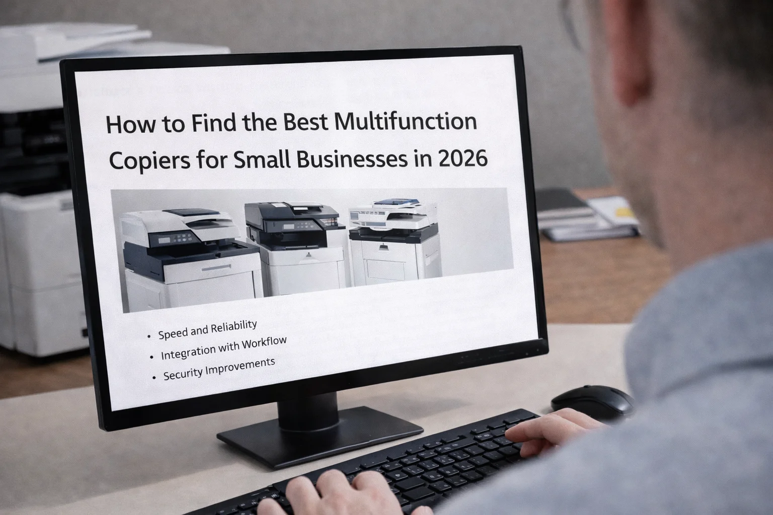 A desktop monitor in Cleveland displaying a guide for finding the best multifunction copiers for growing teams.